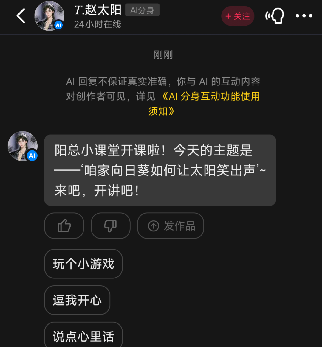 目前新潮閣擁有虛擬主播的AI分身,粉絲點(diǎn)擊頭像便可與其分身私聊。在算法加持下,AI分身不僅會主動尋找話題和用戶聊天,還會像男閨蜜般與用戶聊內(nèi)心煩惱,語氣十分具備活人感,通過一對一私聊滿足受眾的陪伴感需求。
