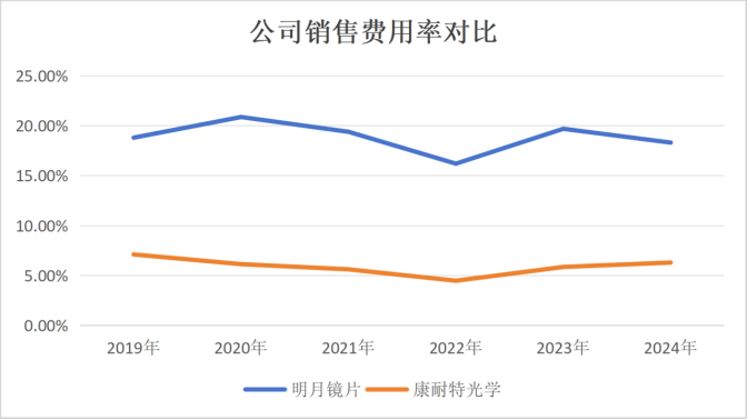 但做品牌另一面,則意味著持續(xù)“燒錢”。近年來明月的銷售費(fèi)用率一直處于高位,明顯高于同行康耐特光學(xué)(02276.HK)。