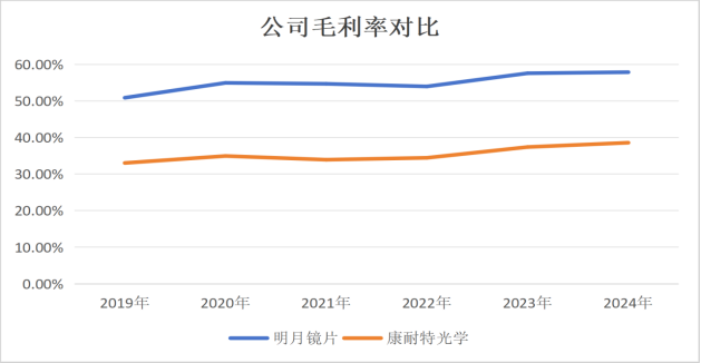 更重要的是,鏡片也早已不只是“矯正視力”的簡單商品,隨著輕薄、耐磨、防藍(lán)光等功能屬性不斷疊加,產(chǎn)品的利潤空間進(jìn)一步被打開。財(cái)務(wù)數(shù)據(jù)同樣印證了這一趨勢:近幾年公司毛利率持續(xù)提升,整體水平高于同行康耐特光學(xué)。