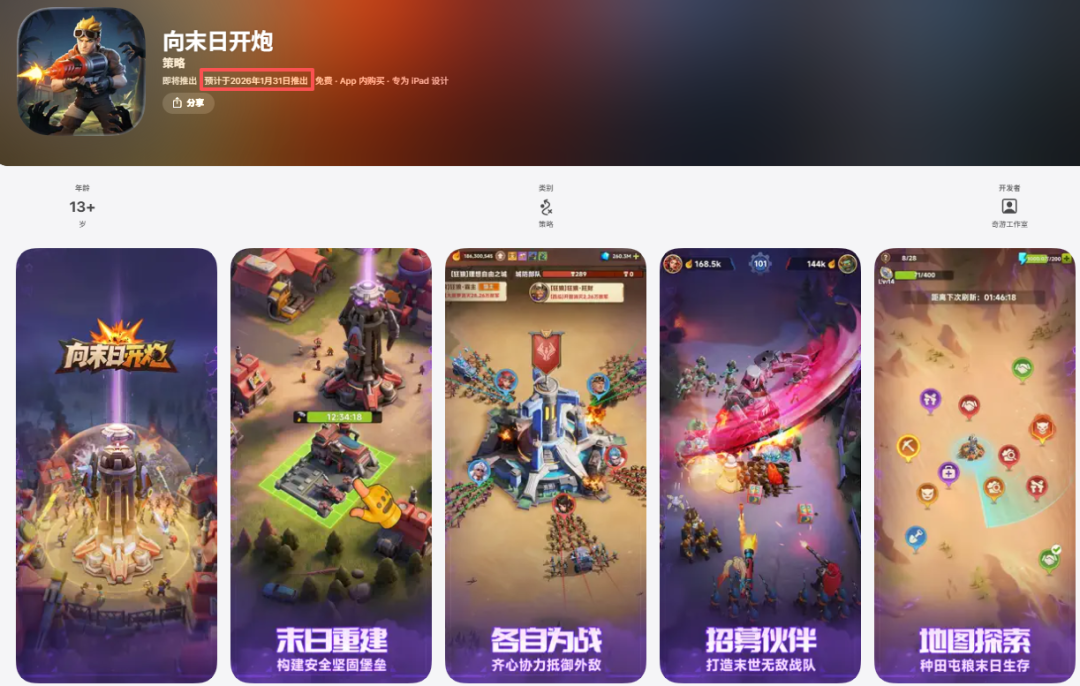 《向末日開炮》采用末日喪尸題材,底層框架類似《Last War》,早些時候已上線小游戲且受到一定關(guān)注,目前其蘋果商店預(yù)約頁面顯示游戲?qū)⒂?月31日正式推出,鑒于前作的成功,該作未來表現(xiàn)值得關(guān)注。