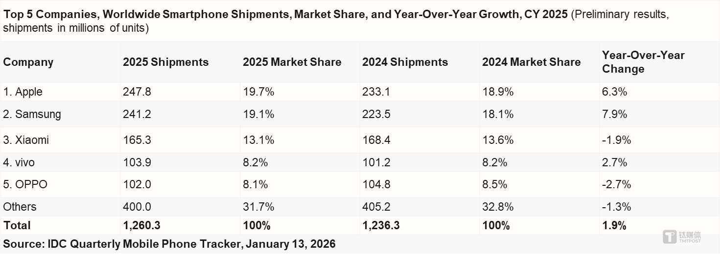 根據(jù)IDC最新發(fā)布的《全球季度手機(jī)跟蹤報(bào)告》初步數(shù)據(jù)顯示,2025全年,全球智能手機(jī)出貨量達(dá)到12.6億部,實(shí)現(xiàn)了1.9%的同比增長。中國智能手機(jī)市場(chǎng)出貨量約2.85億臺(tái),同比下降0.6%。