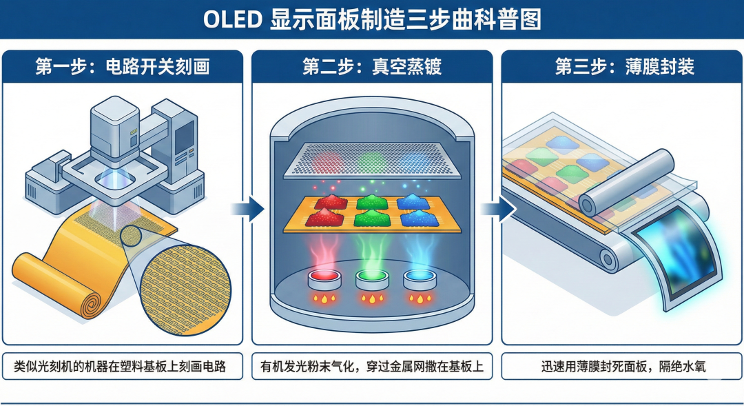 這里得先簡(jiǎn)單介紹一下,造一塊 OLED 屏幕,主要分為三個(gè)步驟: