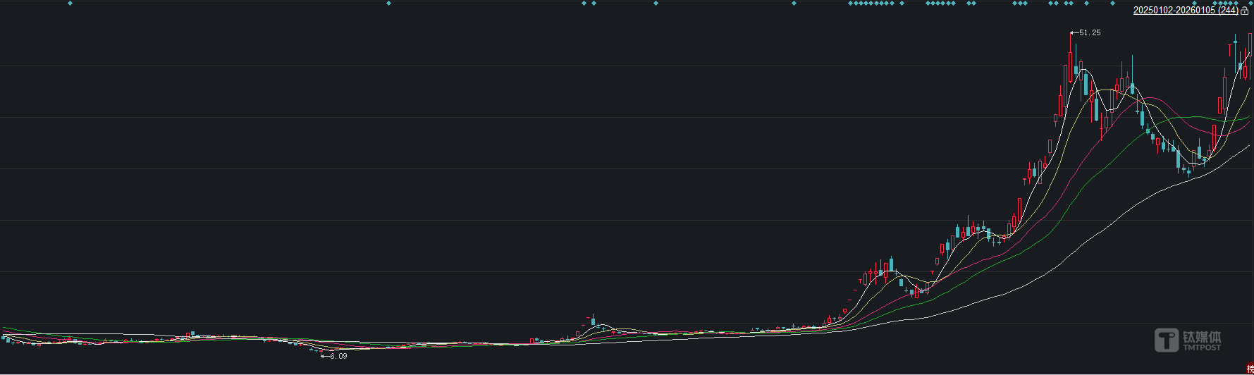 天際股份的業(yè)績反轉,本質上是新能源材料行業(yè)周期復蘇與公司業(yè)務結構共振的結果?;厮?025年全年表現(xiàn),天際股份完美詮釋了“周期貝塔”的力量,年初股價僅8.77元/股,年末收于46.43元/股,期間最高觸及51.25元,漲幅在鋰電大板塊中名列前茅。這份股價狂歡的底層邏輯,終于在業(yè)績預告中落地:全年扭虧為盈,而這一切的核心驅動力,集中在第四季度的行業(yè)回暖。