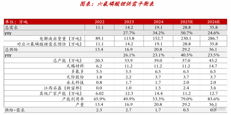 從行業(yè)基本面看,天際股份的扭虧具有階段性行業(yè)特征。中泰證券研報指出,2026年,六氟磷酸鋰市場預計將進入緊平衡狀態(tài)。2024年底全球六氟磷酸鋰有效產能31.9萬噸,需求僅20.8萬噸,產能利用率不足54%;2025年供需格局邊際改善,疊加2026年中國鋰電池總出貨量預計增長近30%、儲能鋰電池出貨量增速超35%的行業(yè)紅利,公司短期內仍將受益于需求擴張。