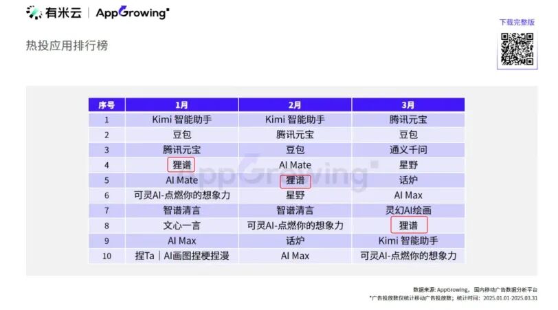 貍譜2025年1-3月投放量均位居熱投應用排行榜前十