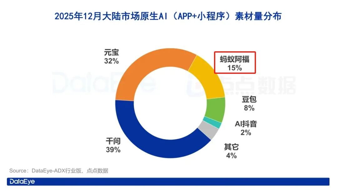 螞蟻:后程發(fā)力,螞蟻阿福12月投放量空降月度買量榜前三、一舉反超豆包,單月共投放了超17萬組素材,占該月AI應用素材投放量的15%。(數(shù)據(jù)來源:DataEye)