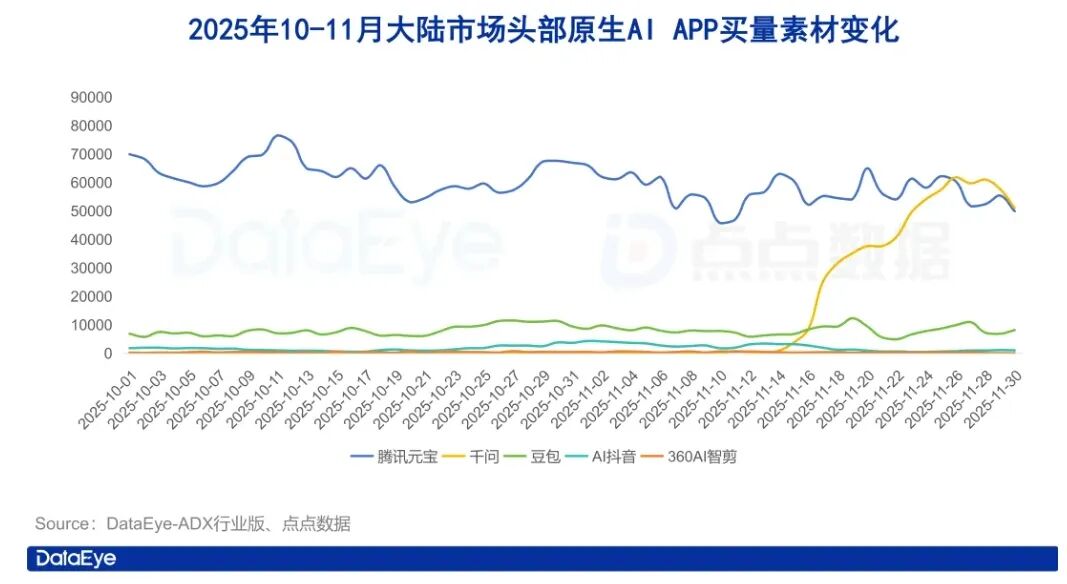 字節(jié):整個2025年除1月之外,豆包投放量均排名前三。據(jù)DataEye研究院和點點數(shù)據(jù)的聯(lián)合統(tǒng)計,2月是一個小高潮,投放量同比增長129.6%,這或許是為了應對元寶突然發(fā)起的猛攻。此外,同屬字節(jié)旗下的貓箱、小云雀也不時發(fā)力,貓箱11月投放量大漲81.75%,小云雀則在10月躋身DataEye研究院AI應用月度買量榜TOP 10。