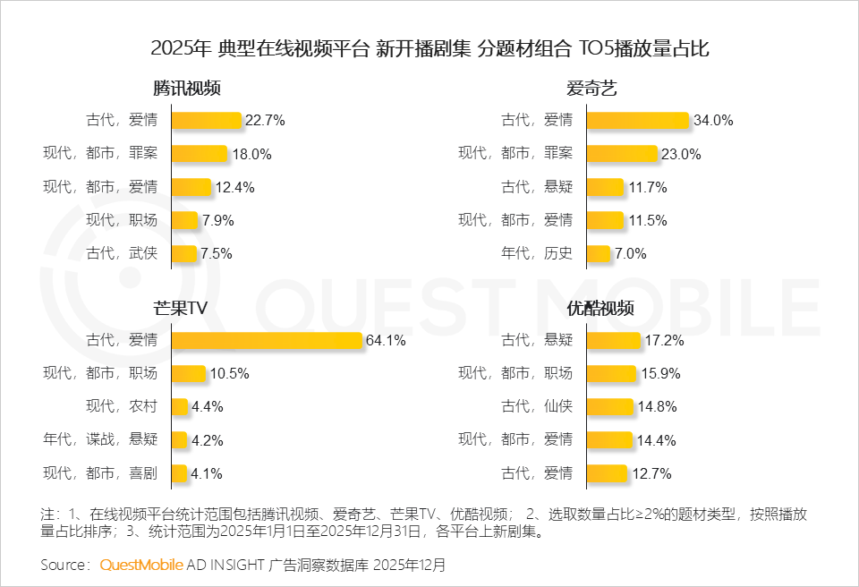 1.4 古代/愛(ài)情題材在各個(gè)平臺(tái)皆表現(xiàn)出色,罪案與懸疑題材有效調(diào)動(dòng)觀眾胃口