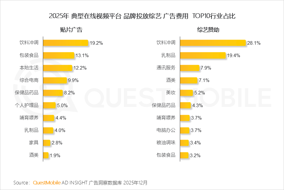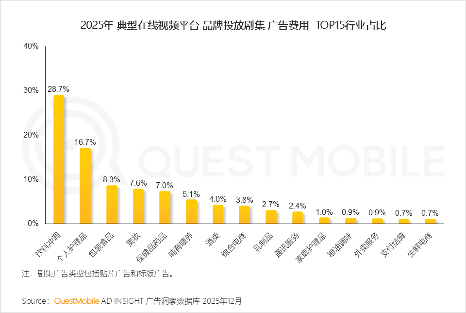 2.1 從廣告營(yíng)收上看,飲料沖調(diào)、個(gè)人護(hù)理品、包裝食品行業(yè)高頻投放劇集廣告,占據(jù)市場(chǎng)近一半投放量
