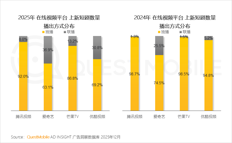 1.2 在線視頻平臺(tái)短劇播出形式以獨(dú)播為主,但聯(lián)播份額占比提升
