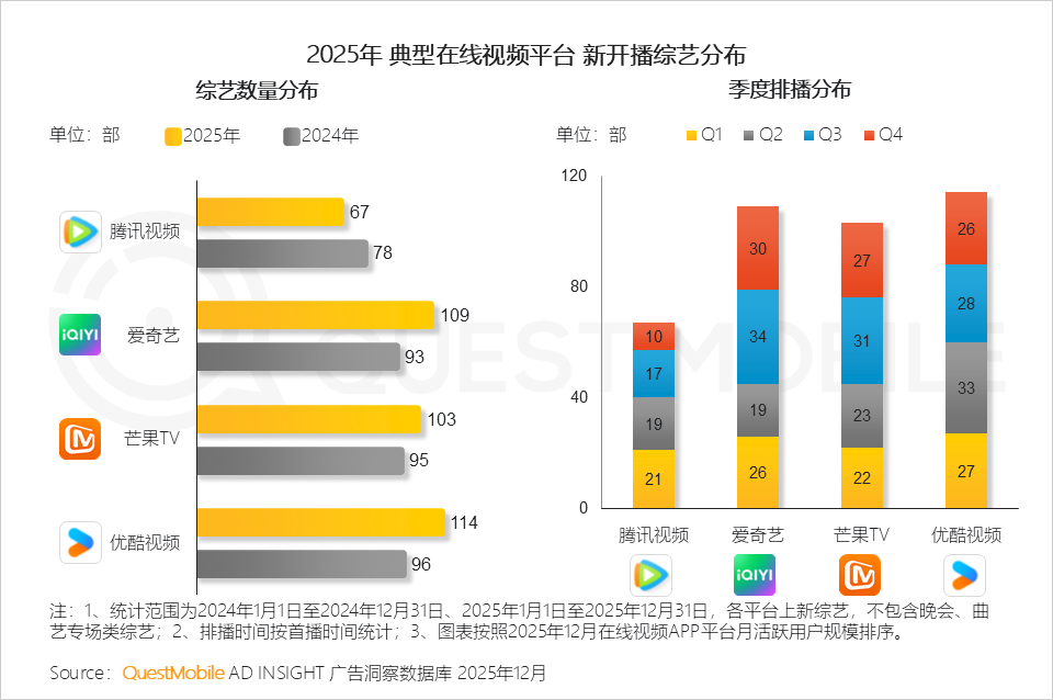 1.1 2025年頭部平臺(tái)綜藝上新數(shù)量小幅提升,同時(shí)也反映了在復(fù)雜競(jìng)爭(zhēng)環(huán)境下,綜藝內(nèi)容投入的重要性