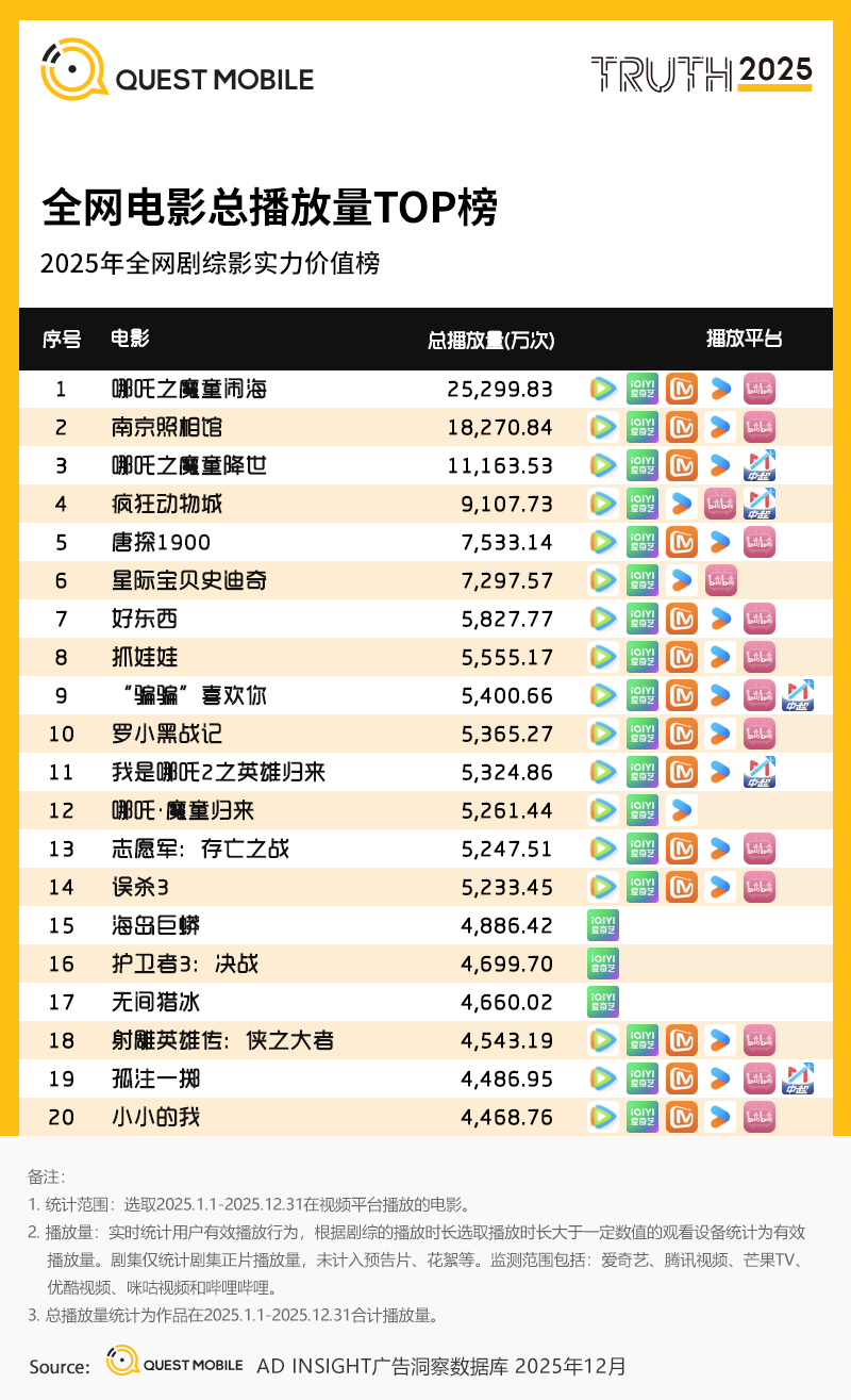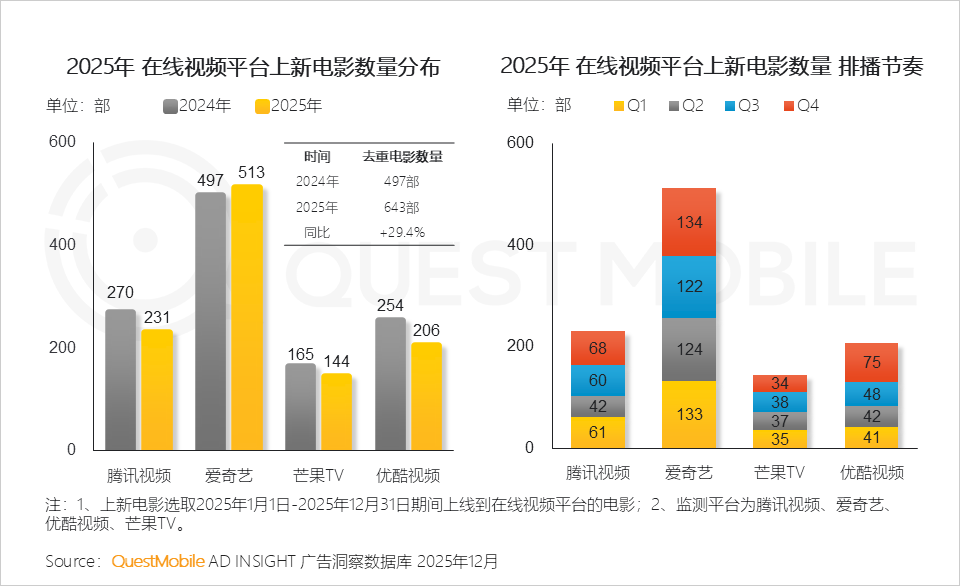 從電影供給數(shù)量看,2025年愛(ài)奇藝電影遙遙領(lǐng)先,超過(guò)500部;第二梯隊(duì)為騰訊視頻和優(yōu)酷視頻,數(shù)量超多200部;從排播節(jié)奏看,騰訊視頻和優(yōu)酷視頻下半年排播較多,愛(ài)奇藝和芒果TV排片節(jié)奏均衡。