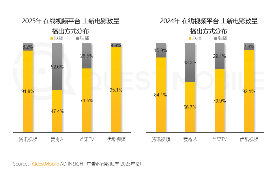 1.3 2025年在線視頻平臺(tái)電影播出形式以聯(lián)播為主,聯(lián)播形式進(jìn)一步強(qiáng)化