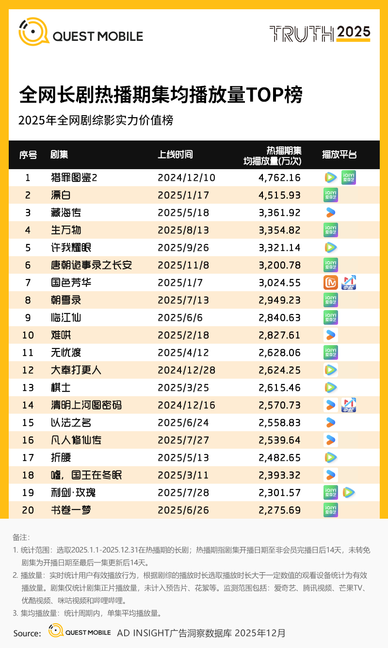 2、全網(wǎng)長(zhǎng)劇熱播期集均播放量TOP榜