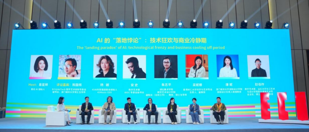 第二場(chǎng)“AI的‘落地悖論’”由易論AI創(chuàng)始人易亞婷主持,ECI@ArTech數(shù)字藝術(shù)創(chuàng)新專委會(huì)秘書長(zhǎng)陳國(guó)輝作為評(píng)議嘉賓,與43AI科技集團(tuán)聯(lián)合創(chuàng)始人楊越、香港樹仁大學(xué)副教授吳妮娜、澳門城市大學(xué)助理教授康妮、汕頭大學(xué)教授趙伯祥等展開對(duì)談,聚焦技術(shù)狂歡與商業(yè)冷靜期的平衡。