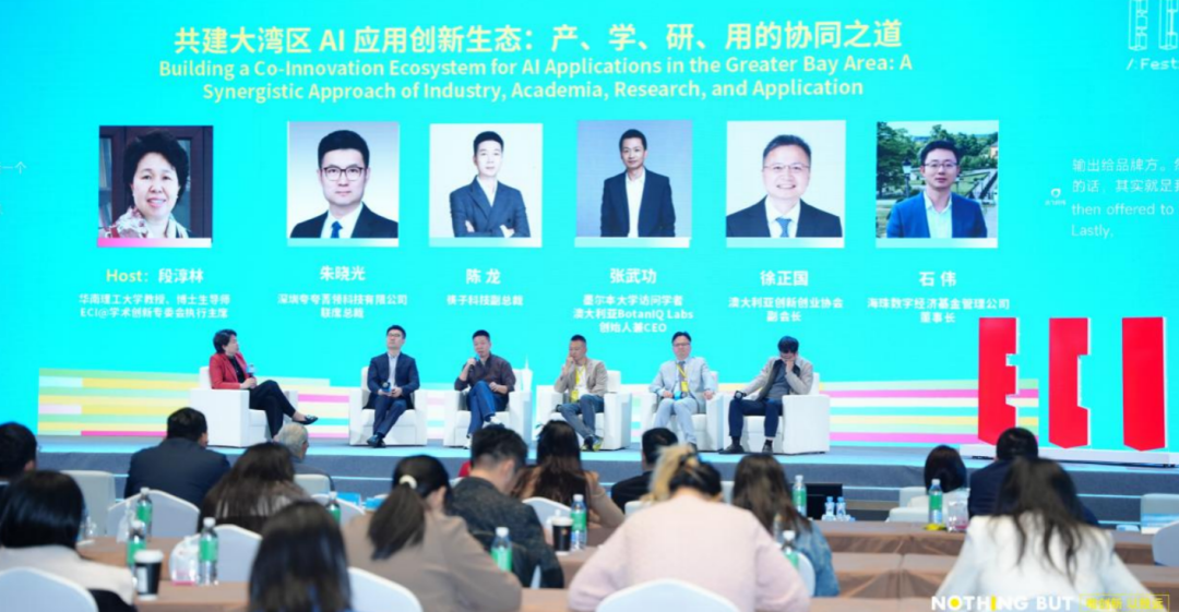 論壇設(shè)兩場(chǎng)圓桌對(duì)話。第一場(chǎng)“共建大灣區(qū)AI應(yīng)用創(chuàng)新生態(tài)”由華南理工大學(xué)教授段淳林主持,深圳夸奇睿領(lǐng)科技聯(lián)席總裁胡偉、筷子科技CTO陳龍、 香港大學(xué)智賦研究院顧問(wèn)唐嘉信博士、海珠數(shù)字經(jīng)濟(jì)基金管理公司董事長(zhǎng)石偉參與,探討產(chǎn)、學(xué)、研、用的協(xié)同之道。