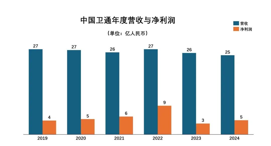 但是,盡管中國衛(wèi)通在資質(zhì)、資源、運(yùn)營能力上優(yōu)勢(shì)顯著,其近6年的業(yè)績表現(xiàn)卻一直平平:年度營收長期穩(wěn)定在26億元左右,從未突破30億元,盈利水平低于10 億元,與壟斷地位嚴(yán)重不符。