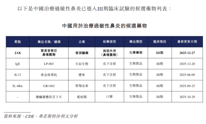 過(guò)敏性鼻炎治療領(lǐng)域的競(jìng)爭(zhēng)同樣激烈。目前在中國(guó)獲批用于該病癥的藥物包括抗組胺藥、糖皮質(zhì)激素、白三烯受體拮抗劑,以及以抗膽堿能機(jī)制為代表的鼻用制劑等多種藥物。截至最后可行日期,在中國(guó)用于治療過(guò)敏性鼻炎的候選藥物共有23款。