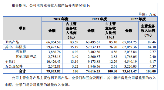 而衛(wèi)浴產(chǎn)品又主要由淋浴房、浴室柜、其他衛(wèi)浴產(chǎn)品構(gòu)成,其中淋浴房產(chǎn)生的銷售收入分別為62059.36萬元、57232.17萬元、59422.67萬元,分別占當(dāng)期主營業(yè)務(wù)收入的84.3%、76.7%、75.19%,是公司最核心的營收來源。