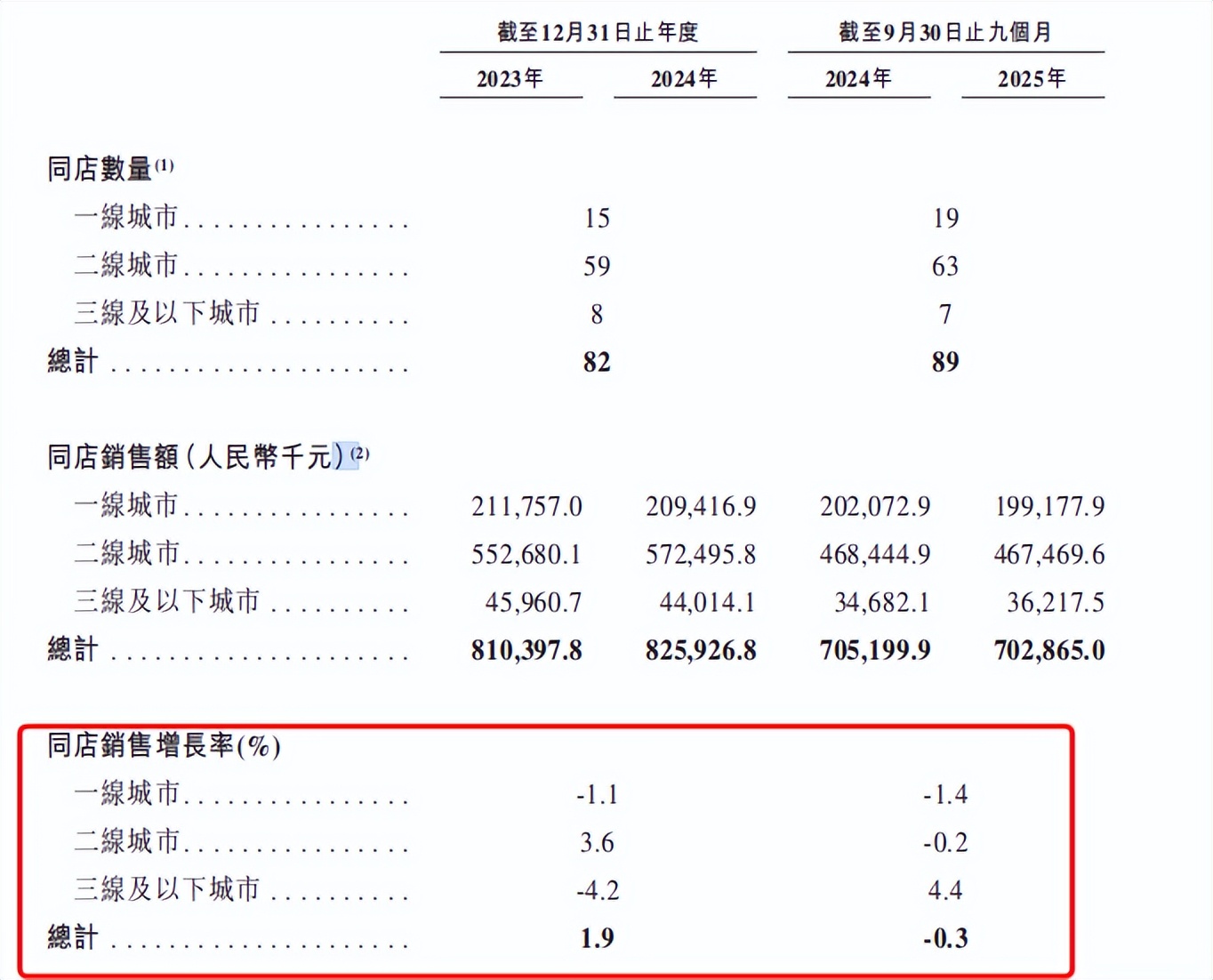 幻師招股書顯示,2024年及2025年前三季度,一線城市的同店銷售額分別同比下滑1.1%、1.4%;整體同店銷售額,也在2025年前三季度同比下滑0.3%,由正增長轉(zhuǎn)為負(fù)增長。