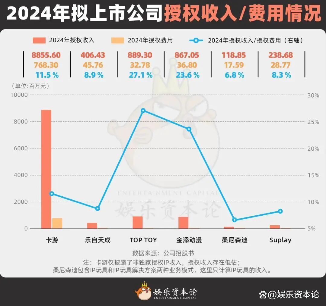 《娛樂資本論》曾整合上述6家潮玩公司的招股書數(shù)據(jù),對比2024年授權(quán)IP產(chǎn)品收入與授權(quán)費(fèi)用的比值。結(jié)果顯示,卡游以11.5%領(lǐng)先,而桑尼森迪僅為6.8%,處于末位。這個(gè)比值越高,意味著公司對IP的運(yùn)營和變現(xiàn)能力越強(qiáng),反之越弱。
