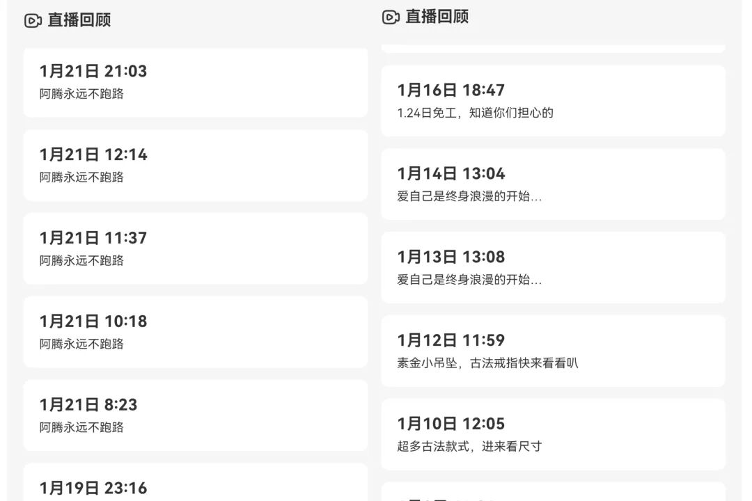圖 | 張志騰的直播記錄,1月21日這天的連續(xù)直播,讓許多人相信了他,甚至有人不顧官方勸阻,繼續(xù)充值
