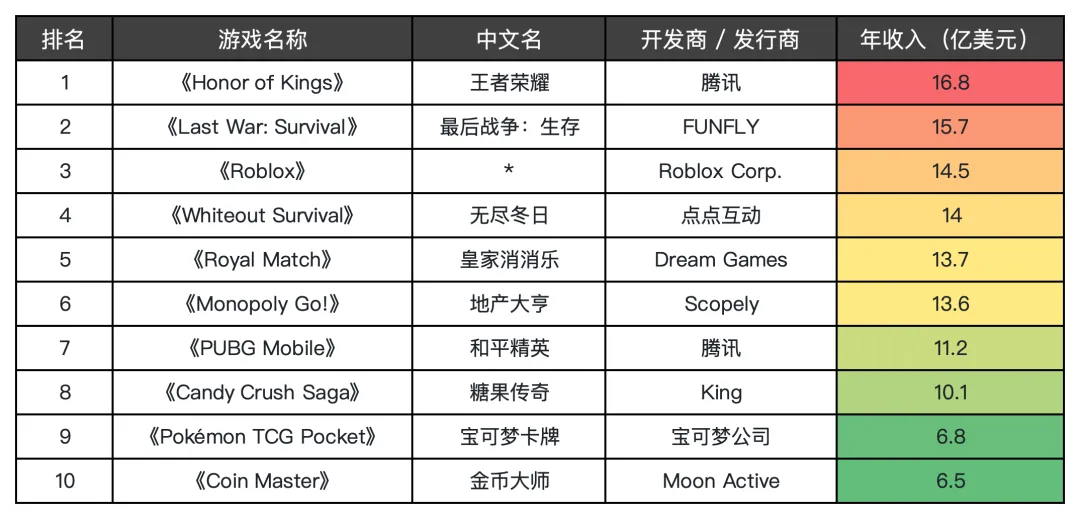 而這,已經(jīng)是游戲出海連續(xù)第六年突破千億大關(guān)。這一年,全球最賺錢的TOP10游戲,攬獲了近123億美元的收入。