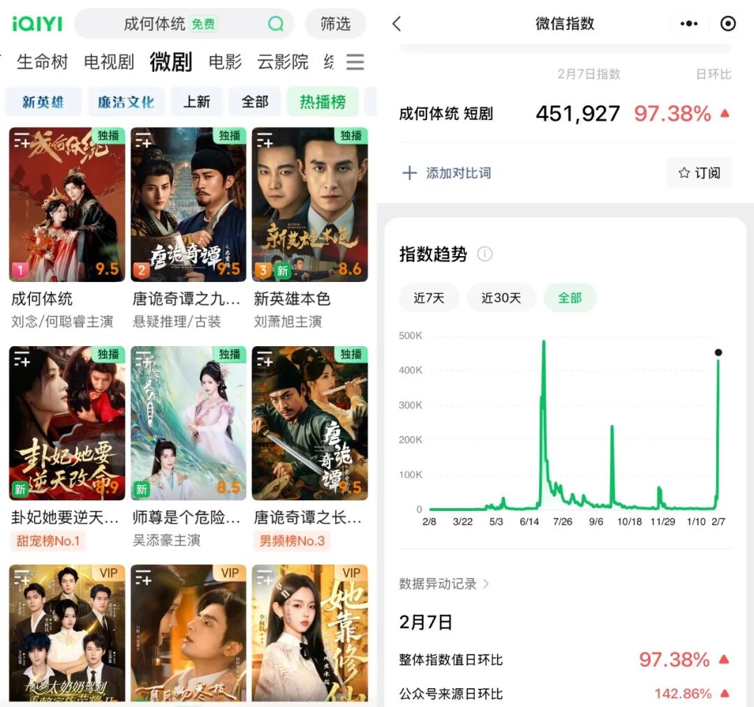 上線才三天,劇集《成何體統(tǒng)》在愛奇藝的熱度就突破9000,并有望在春節(jié)期間繼續(xù)突破。這個熱門女頻IP曾先后改編過動漫、短劇,在劇集熱播的同時,《成何體統(tǒng)》短劇版也沖到了愛奇藝微劇熱播榜榜首,微信指數(shù)直線飆升,直逼去年6月首次開播之時。