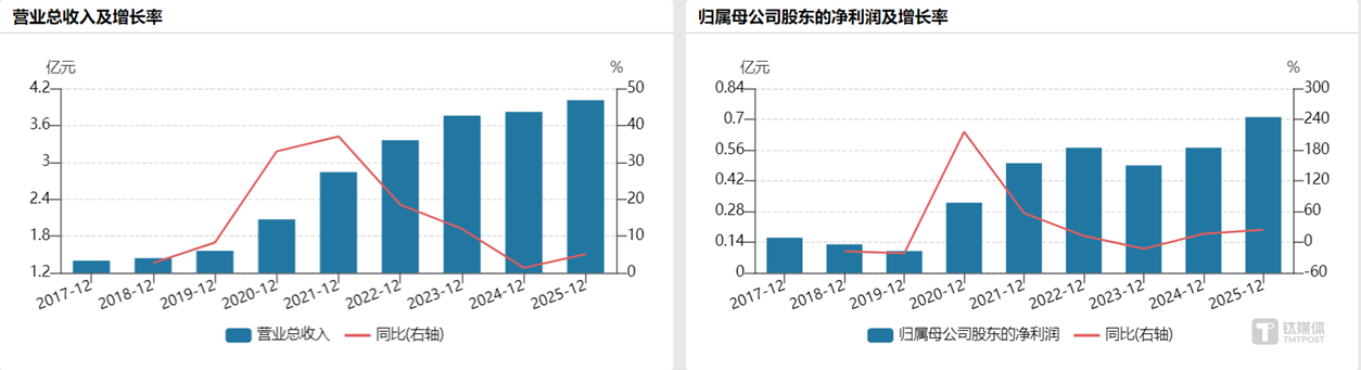 賬面上,嘉晨智能業(yè)績體量不大,但增勢尚穩(wěn)。2022年-2024年及2025年上半年,公司營業(yè)收入分別為3.36億元、3.76億元、3.82億元和1.91億元;凈利潤分別為5662.3萬元、4927.49萬元、5737.47萬元和3082.72萬元。收入增速多為低個位數(shù)徘徊;凈利潤恢復明顯,凈利率相應從約13%回升到接近18%。