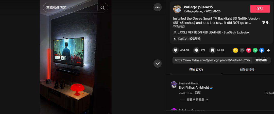 在TikTok上,Govee與Vloger@katlego.pilane15合作,展示了如何用Govee燈帶裝飾房間,獲得了43.3萬的點贊,吸引了大量用戶的關注。