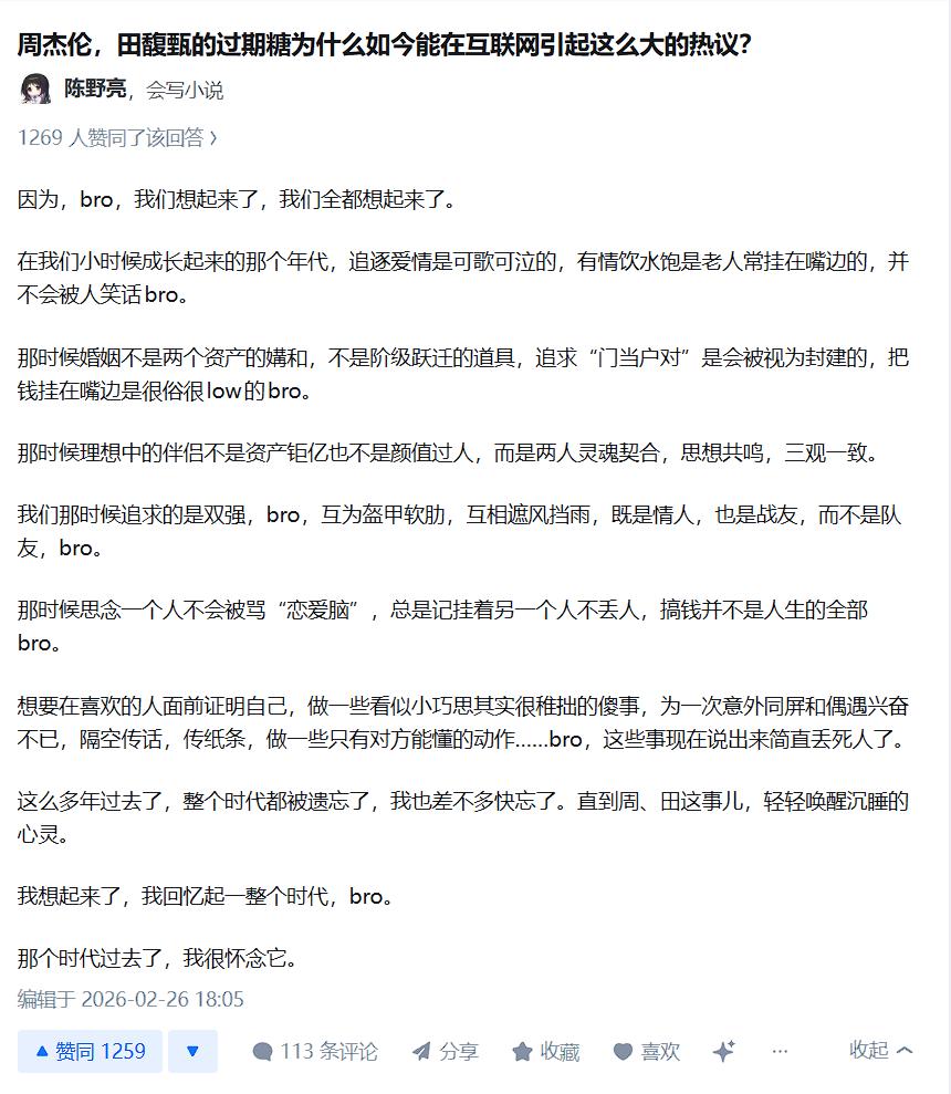 這條回答之所以能引發(fā)如此廣泛的共鳴,正是因?yàn)樗莱隽诉@場(chǎng)風(fēng)潮的本質(zhì):周杰倫與田馥甄之間那些“隔空傳話(huà)、寫(xiě)歌藏頭、做只有對(duì)方懂的小動(dòng)作”,恰恰擊中了當(dāng)下社會(huì)對(duì)“去功利化情感”的渴望。