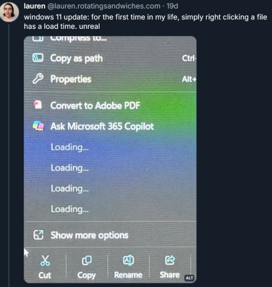 圖注:微軟用戶表示:“我這輩子頭一次,‘右鍵點擊’會看見‘載入’提示。”