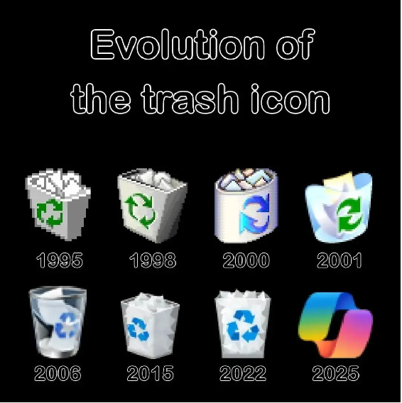 有用戶作圖,展現(xiàn)“三十年來Windows系統(tǒng)中‘垃圾’圖標的演化”,最終結(jié)果是Copilot圖標。