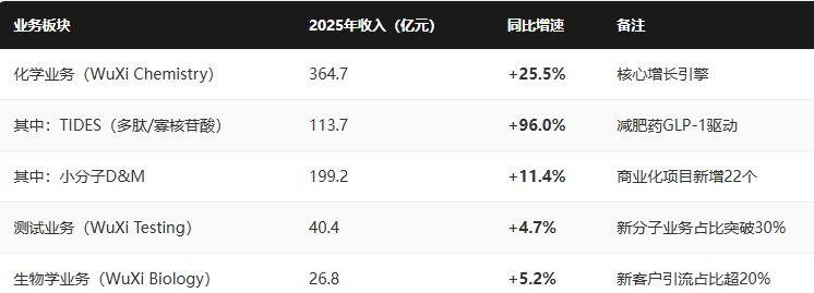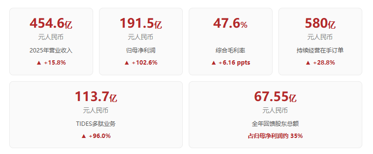 2025年,藥明康德多肽業(yè)務(wù)的爆發(fā)式增長(zhǎng)與CRDMO模式的規(guī)模效應(yīng),共同支撐了營(yíng)收與盈利的雙重提升。