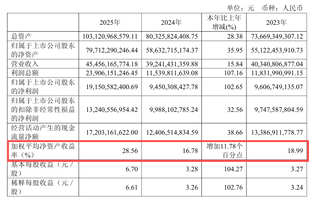 業(yè)務(wù)結(jié)構(gòu)的優(yōu)化直接傳導(dǎo)至盈利端。2025年公司毛利率從上年的約41.48%躍升至47.64%,一年之內(nèi)提升逾6個(gè)百分點(diǎn);加權(quán)平均凈資產(chǎn)收益率達(dá)28.56%,較上年增加11.78個(gè)百分點(diǎn)。