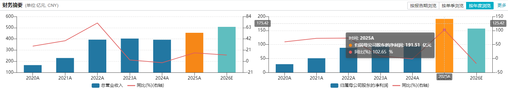 公司全年實(shí)現(xiàn)營(yíng)業(yè)收入454.6億元,同比增長(zhǎng)15.84%;歸屬于上市公司股東的凈利潤(rùn)191.51億元,同比激增102.65%,利潤(rùn)增速是營(yíng)收增速的6倍有余;扣非凈利潤(rùn)132.41億元,同比增長(zhǎng) 32.56%,顯著跑贏(yíng)營(yíng)收。