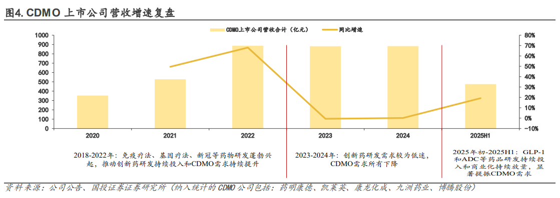 多肽大單品商業(yè)化持續(xù)放量,推動(dòng)CDMO多肽訂單增長(zhǎng),國(guó)內(nèi)CDMO企業(yè)產(chǎn)能儲(chǔ)備充足、在手訂單充裕,相關(guān)收入高速增長(zhǎng);GLP-1和ADC領(lǐng)域外包訂單的提振,也讓相關(guān)CDMO公司收入同比增速邊際改善。
