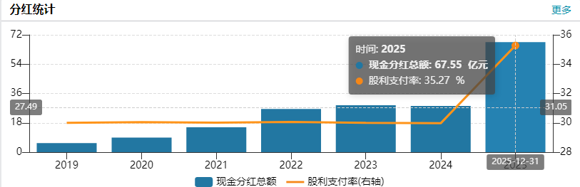 股東回報(bào)方面,公司2025年累計(jì)現(xiàn)金分紅67.55億元,疊加20億元股份回購(gòu)注銷(xiāo),合計(jì)回報(bào)股東87.55億元,占?xì)w母凈利潤(rùn)比例45.72%,年度利潤(rùn)分配擬每10股派息15.7927元(含稅),疊加中期與特別分紅,全年每10股累計(jì)派息22.7927元。