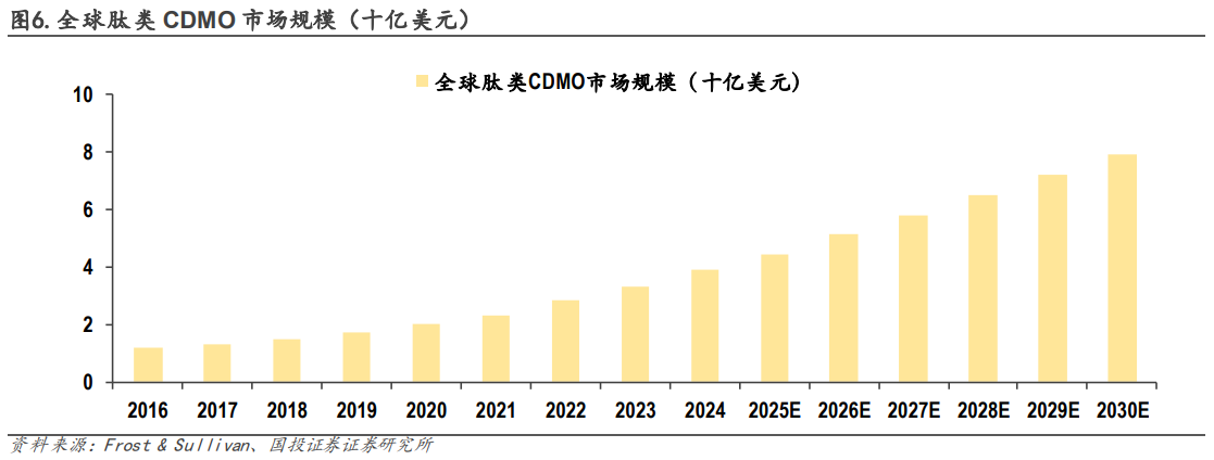 同時(shí)報(bào)告預(yù)測(cè),全球醫(yī)藥研發(fā)外包服務(wù)市場(chǎng)(不包括大分子和CGT CDMO)規(guī)模將由2024年的1365億美元增長(zhǎng)到2029年的2395億美元,復(fù)合年增長(zhǎng)率約11.9%,顯著高于行業(yè)平均水平;其中2025年全球肽類(lèi)CDMO市場(chǎng)規(guī)模為44億美元,2030年有望增長(zhǎng)至79億美元。
