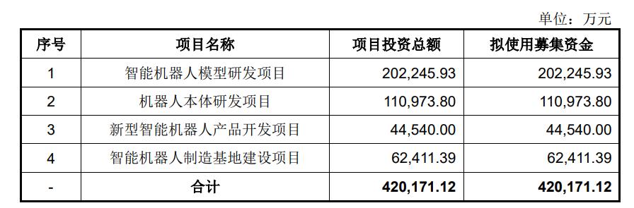 根據(jù)招股書顯示,宇樹本次融資總額為42.02億元,具體分為智能機器人模型研發(fā)20.22億元、機器人本體研發(fā)11.10億元、新型智能機器人產品開發(fā)4.45億元、智能機器人制造基地建設6.24億元,共計四個項目。從募資分配計劃中不難看出,做機器人模型是宇樹當下最重要的任務。