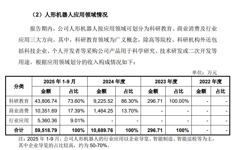 另一邊,宇樹在上市問詢函的回復中還提到,公司目前人形機器人產品應用領域還是以教育科研為主。這代表著,從宇樹的視角看,人形機器人的真實使用場景可能沒有市面上那么樂觀,機器人表演、進廠打工、商業(yè)導覽等用途,還不是主流需求。