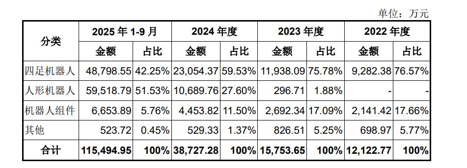 2025年1-9月宇樹營業(yè)收入11.67億元,凈利潤達到1.05億元。主營業(yè)務收入中,四足機器人營收占比為42.25%,人形機器人占比為51.53%,其余營收為機器人組件和其他。兩類機器人產品的毛利率表現(xiàn)相當不錯,分別為55.49%和62.91%。綜合算下來,宇樹整體毛利率高達59.83%,簡直比蘋果賣手機都賺。
