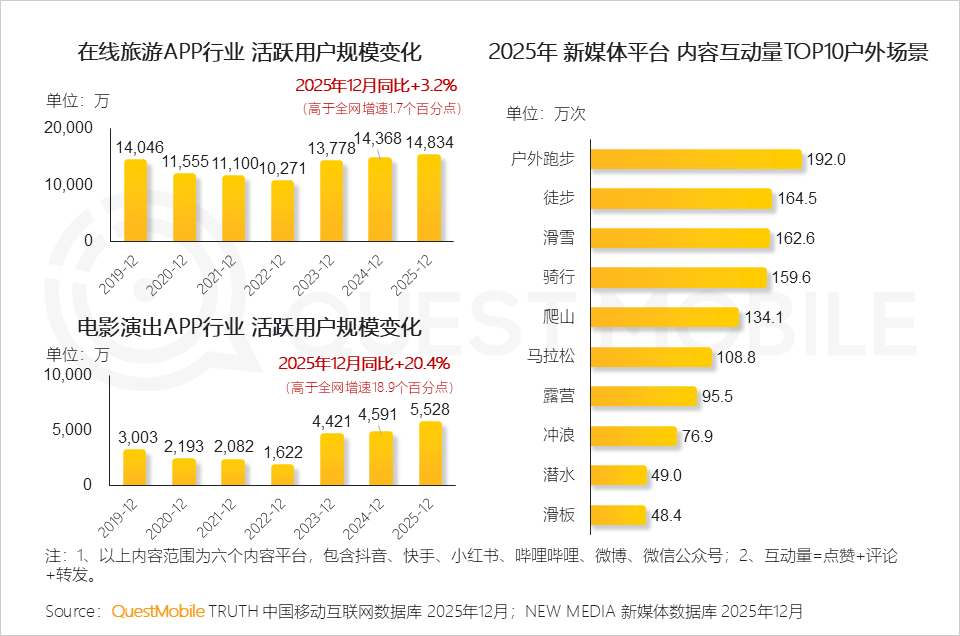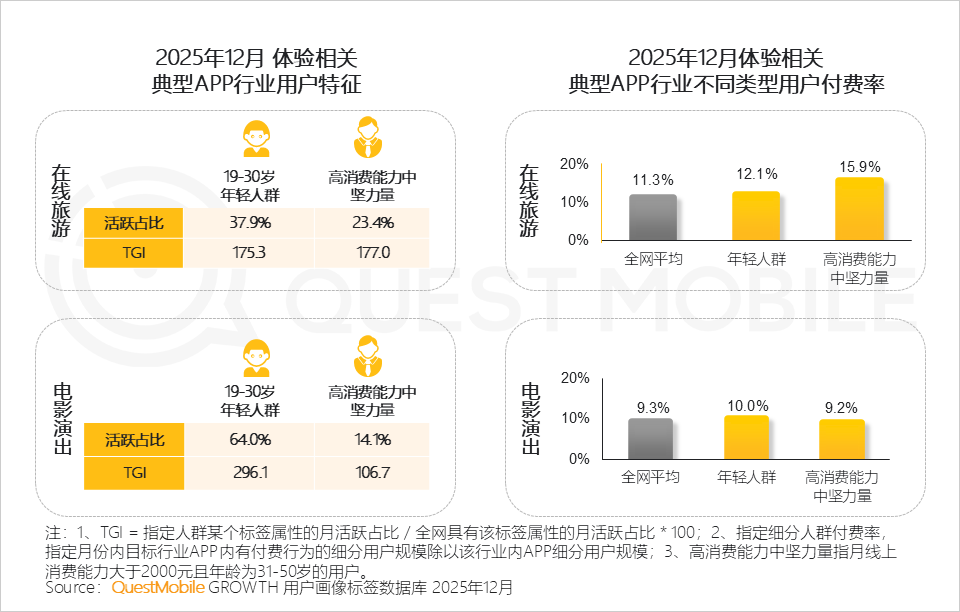 QuestMobile數(shù)據(jù)顯示,年輕人群和高消費(fèi)能力用戶高度活躍在旅游、電影演出類體驗(yàn)活動(dòng),且付費(fèi)率普遍高于全網(wǎng)平均水平。