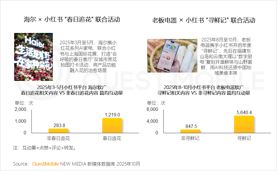 亦或融入日常生活體驗(yàn)。海爾、老板電器等品牌與小紅書線下生活方式IP綁定,將品牌深度植入“追花”、“尋鮮”等具體的生活方式體驗(yàn)中,通過用戶的現(xiàn)場(chǎng)體驗(yàn)與線上分享,實(shí)現(xiàn)品效協(xié)同與口碑?dāng)U散。