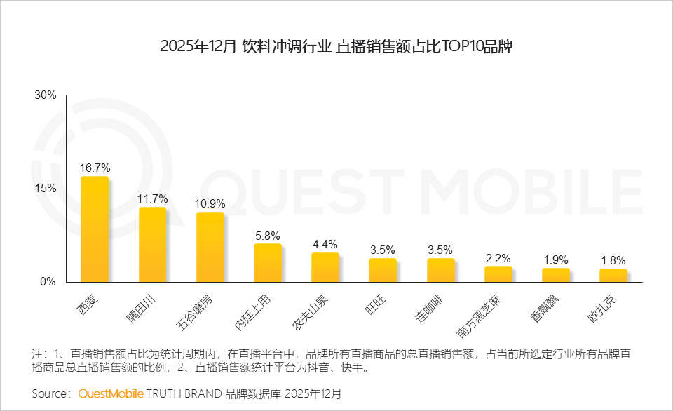 2025年12月直播銷售額排名前十的品牌中,主打健康理念的品牌占比較高,其中五谷磨房、內(nèi)廷上用以中式食養(yǎng)為主要方向,西麥、南方黑芝麻、歐扎克品牌也更側(cè)重健康理念。