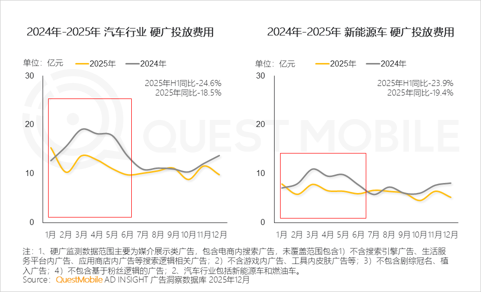 2.1 2025年整體汽車行業(yè)互聯(lián)網(wǎng)硬廣投放呈下降趨勢(shì),上半年費(fèi)用顯著減少,下半年費(fèi)用基本持平,新能源車投放情況與大盤保持一致
