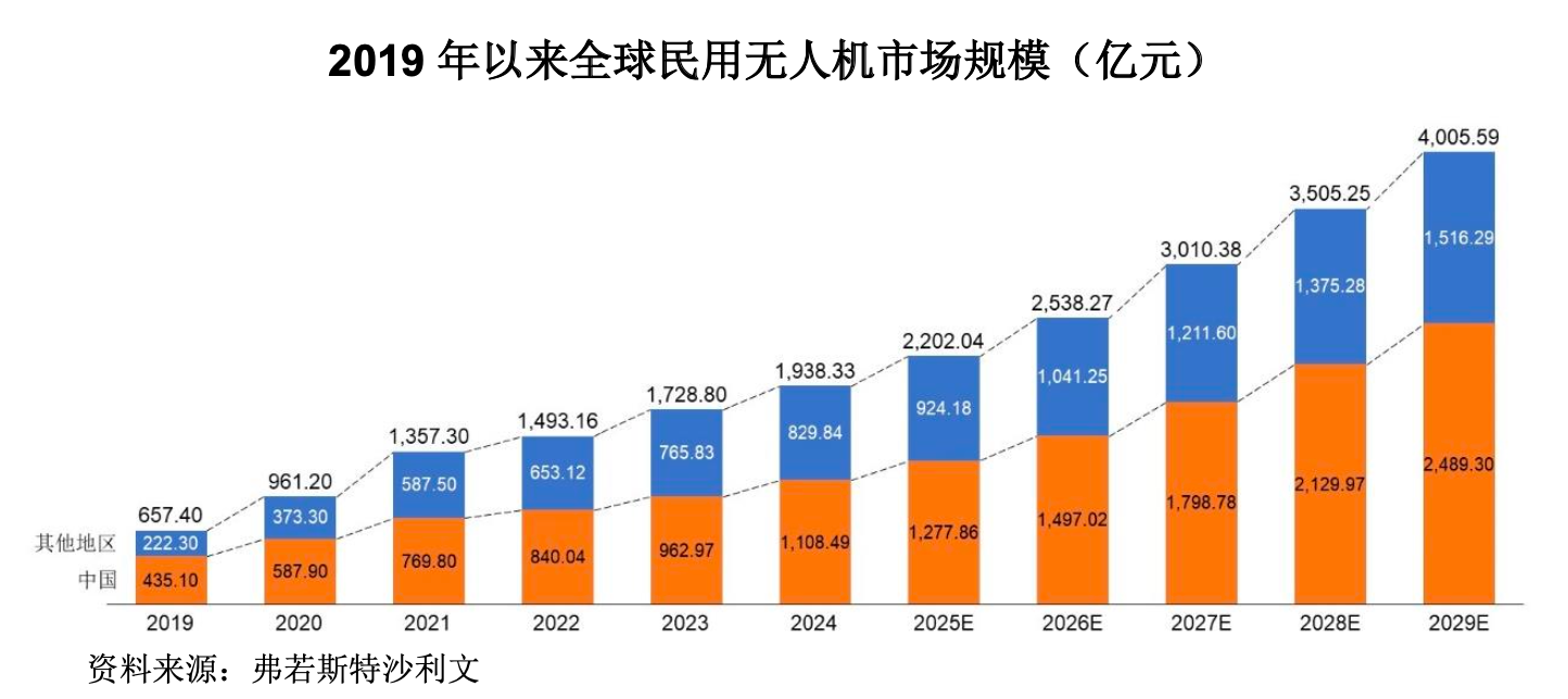 國內(nèi)市場同樣蓬勃。作為全球第一大民用無人機(jī)市場,中國民用無人機(jī)行業(yè)市場規(guī)模從2019年的435.10億元增長至2024年1108.49億元,復(fù)合增長率為20.57%;預(yù)計(jì)到2029年,這一數(shù)字將增至2489.30億元。