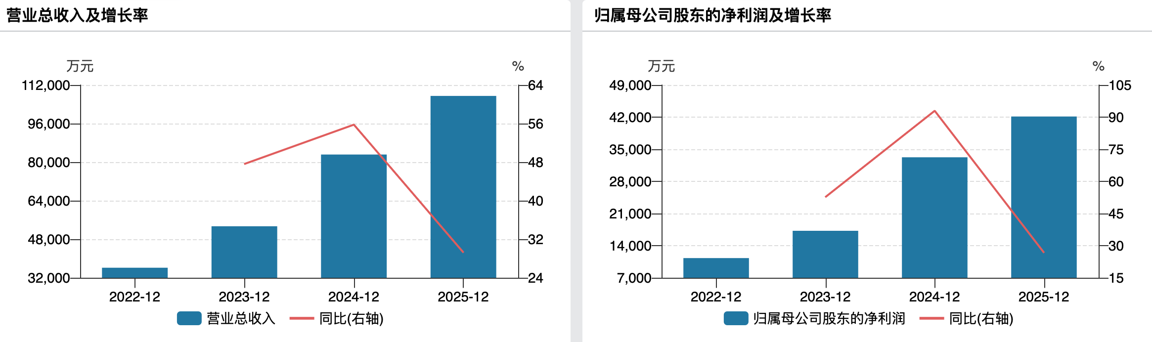 業(yè)績是最好的佐證。招股書顯示,2022年—2025年,公司分別實(shí)現(xiàn)營業(yè)收入3.61億元、5.34億元、8.31億元和10.75億元,最近三年同比增長47.61%、55.77%、29.25%;歸母凈利潤1.13億元、1.72億元、3.33億元和4.21億元,最近三年增長率分別為52.69%、92.96%和26.73%。