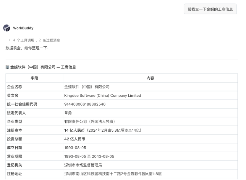 AI告訴我裝好之后,我反手讓它就查了它的東家金蝶,看看會有什么結(jié)果。