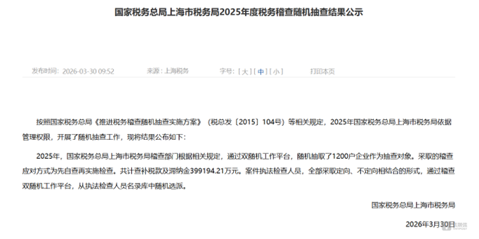 2026年3月底,上海市稅務(wù)局公布2025“雙隨機(jī)、一公開”抽查結(jié)果:通過平臺(tái)隨機(jī)抽取 1200 戶企業(yè)開展稅務(wù)稽查,全年共查補(bǔ)稅款及滯納金合計(jì) 39.92 億元,與2024年同口徑金額相比,漲幅接近78%。
